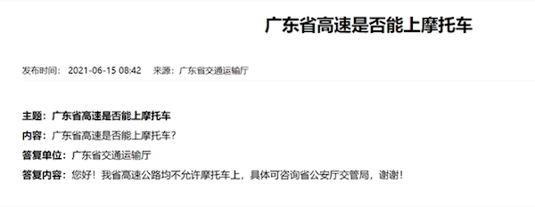 根据2021年6月15日广东省交通运输厅官方回复,广东省高速公路均不允许摩托车上。