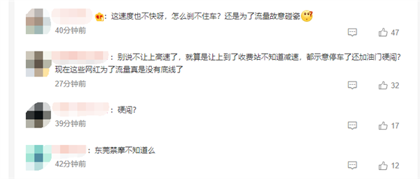 该事件曝光后,引起网友热议,有网友表示:“别说不让上高速了,就算是让上到了收费站不知道减速,都示意停车了还加油门硬闯?现在这些网红为了流量真是没有底线了”“这速度也不快呀,怎么刹不住车?还是为了流量故意碰瓷”。
