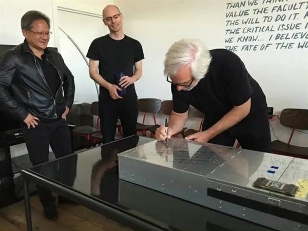 老黄在机器上签下“致Elon和OpenAI 团队,为了计算和人类的未来。”