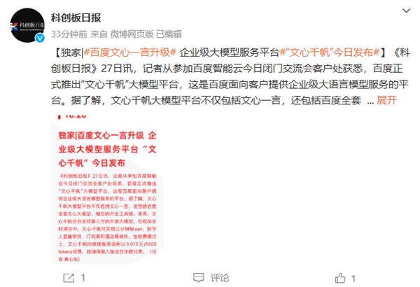 根据《科创板日报》消息,有参加百度智能云闭门交流会的客户表示,百度在会上正式推出了“文心千帆”大模型平台,这是百度面向客户提供企业级大语言模型服务的平台。
