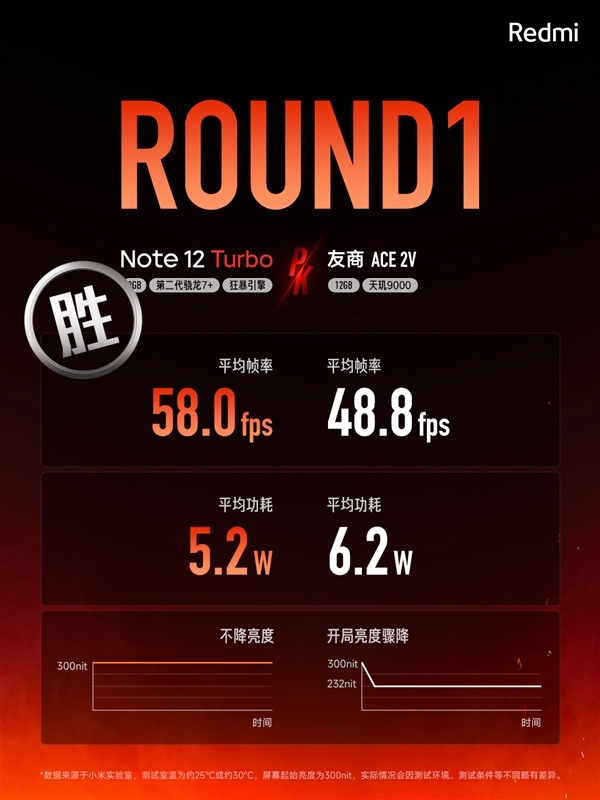 在Redmi Note 12 Turbo发布会的热门游戏性能对比环节中,Note 12 Turbo平均帧率、平均功耗都要比搭载天玑9000的一加Ace 2V出色。