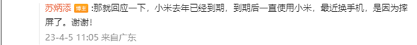 其本人在评论区回应称,他与小米进行的合作已经在去年到期,更换手机的原因是旧手机的屏幕已经摔坏。