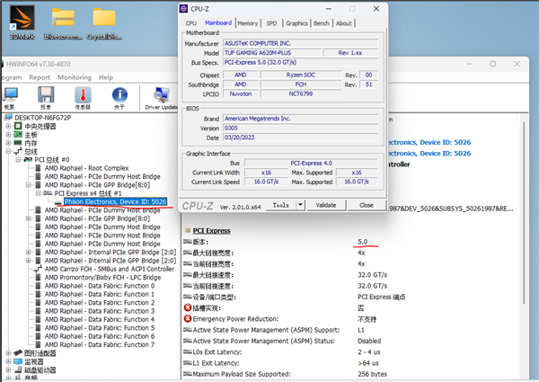 比如说TUF GAMING A620M-PLUS主板上,HWiNFO64可以检测到PCIe 5.0已经开启,并且支持完整的4条通道,最高带宽32GT/s。