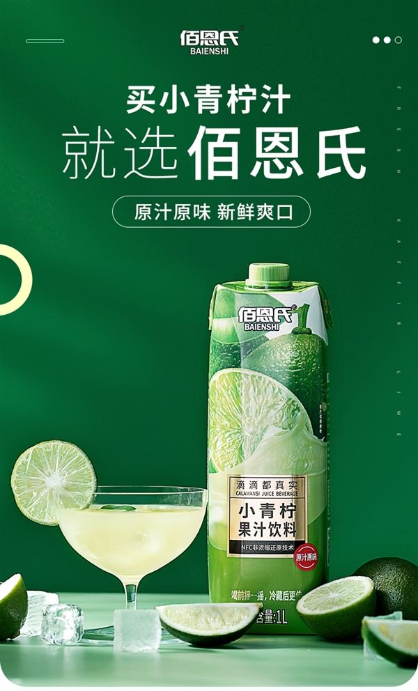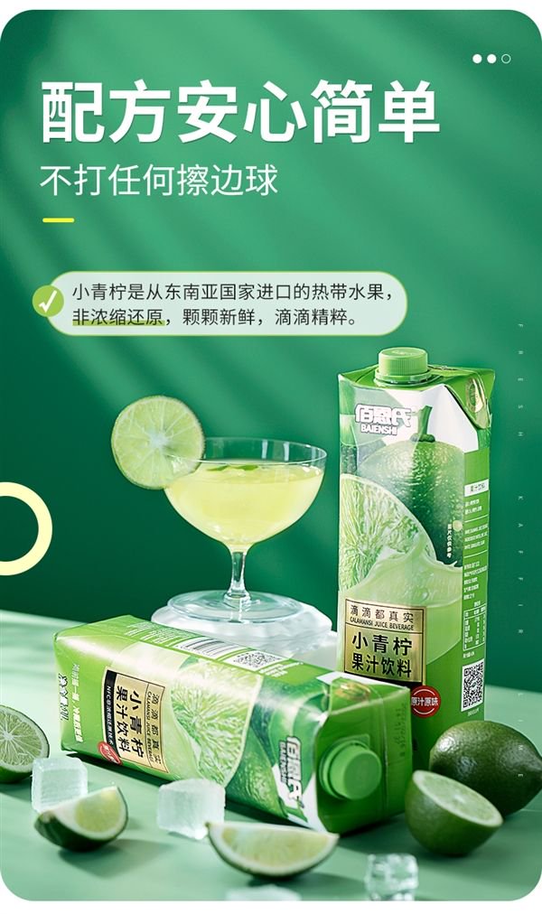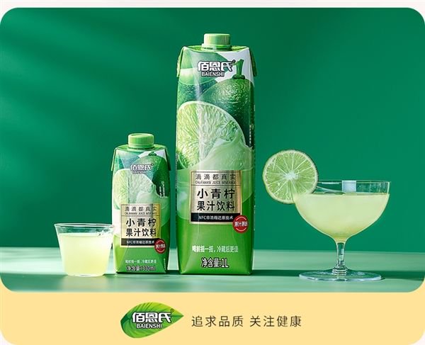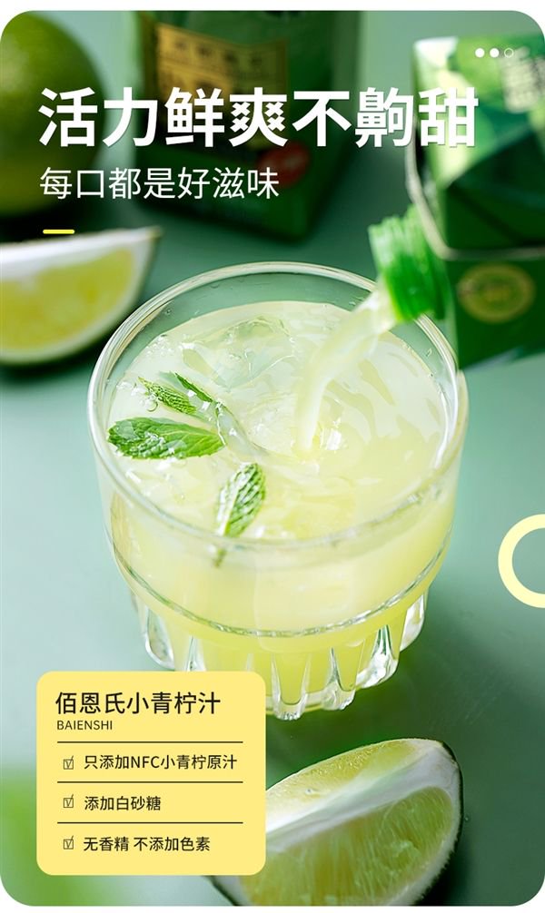 小青柠是从东南亚国家进口的热带水果,非浓缩还原,颗颗新鲜,只添加NFC小青柠原汁,无香精不添加色素,活力鲜爽不齁甜,每口都是好滋味!