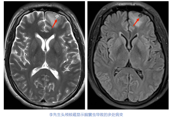 得到线索后第一时间检查,最终发现,李先生头颅MR显示其脑内有寄生虫感染,明确诊断为脑囊虫病。