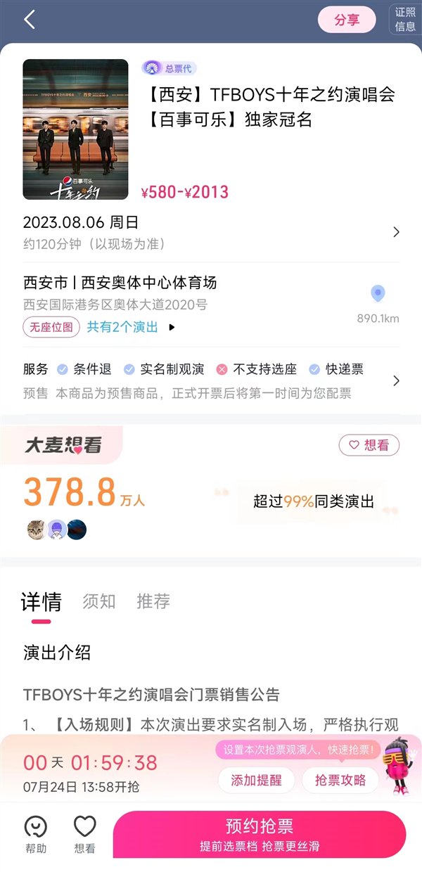 同时,为了打击黄牛囤票,据购票平台显示,本次演唱会不支持选座,要求实名制观演,平台不支持转赠与转售,入场需要人脸、证件、票面信息相匹配。