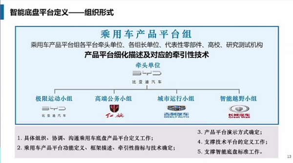 比亚迪承担的是极限性能平台小组,红旗是高端公务小组,吉利承担城市运行小组,长城承担智能越野小组。