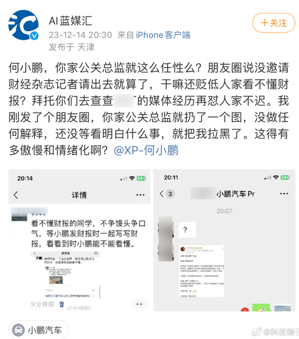 结果,这位媒体后续反映称被小鹏汽车公关总监拉黑,拉黑之前发给他一张一位博主的微博截图,表达了他对小鹏汽车请出那位媒体人员的看法。