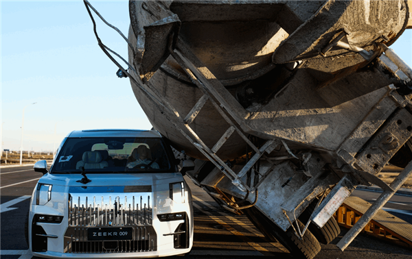 极氪官方此前还曾进行过极氪009“双A柱”,挑战30吨混凝土搅拌车动态顶压测试。