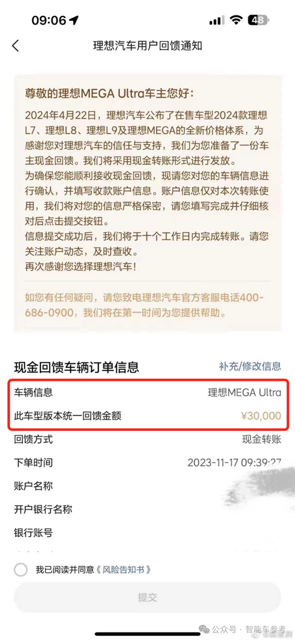 理想汽车给出了差价退款的政策: