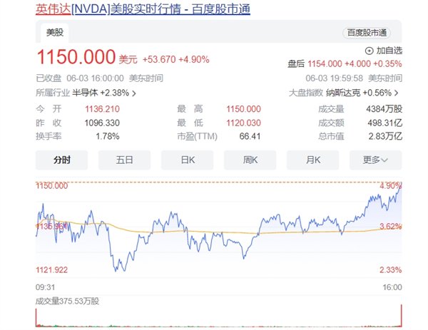 快科技6月4日消息,美股周一收盘,英伟达涨近5%,报收1150美元,再创历史收盘新高,市值一夜大涨1320亿美元(约合人民币9570亿元)。