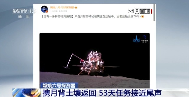 6月21日,嫦娥六号探测器的官方新媒体号发布信息表示,来自月球的“神秘包裹”正在运输中,运输进度已超70%。