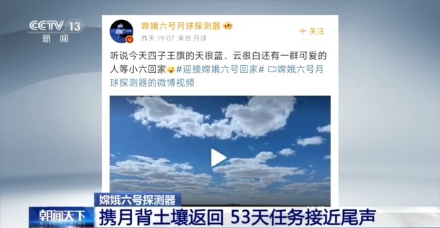 昨天晚上7时,嫦娥六号探测器又在新媒体号上发了这么一条消息:“听说今天四子王旗的天很蓝、云很白还有一群可爱的人等小六回家”,并配了蓝天白云和一望无际的大草原。