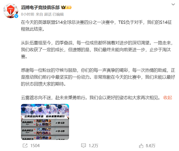 赛后,TES滔搏电子竞技俱乐部官微道歉,称“非常抱歉在今天的比赛中,我们未能以最好的状态回馈大家的期待。”