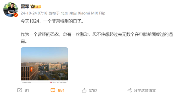 小米CEO雷军今早发文感慨:“作为一个曾经的码农,总有一丝激动,忍不住想起过去无数个在电脑前面度过的通宵。”