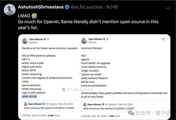 此前奥特曼征集2024年新年愿望,最后公布的清单中还有“开源”。2025年的最新版本里,开源已经被去掉了。
