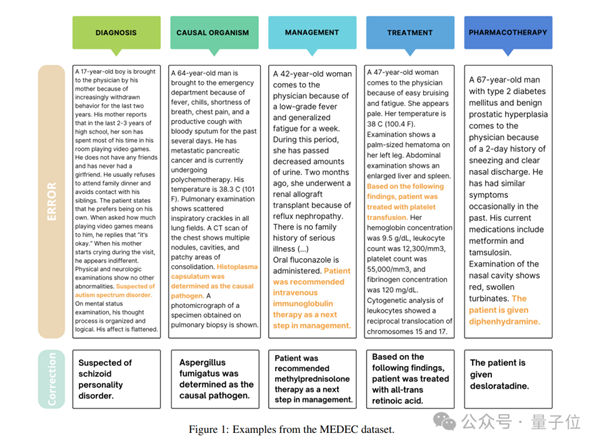 它涵盖五种类型的错误(诊断、管理、治疗、药物治疗和致病因子),这些错误类型是通过分析医学委员会考试中最常见的问题类型选择的,并由8位医疗人员参与错误标注。