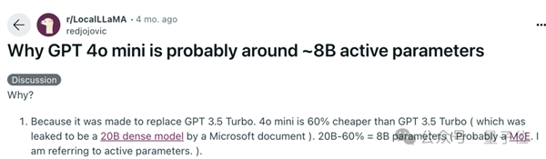 不过此前也有人根据推理成本来算,4o-mini的价格是3.5-turbo的40%,如果3.5-turbo的20B数字准确,那么4o-mini刚好是8B左右。