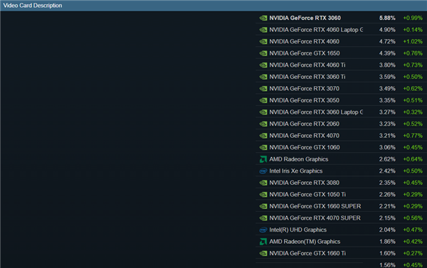 显卡方面,RTX 3060仍然高居第一,份额位5.88%,又增加了0.99个百分点,然后是RTX 4060的移动版、桌面版,分别占4.90%、4.72%。