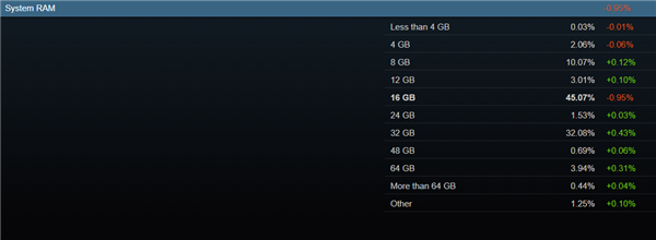 用户比例最高的是16GB,仍然有45.07%,不过这次降低了0.95个百分点。