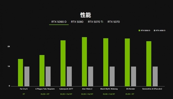 官网还以《赛博朋克2077》《黑神话》等游戏为测试案例,展示了RTX 5090D、RTX 5080、RTX 5070Ti、RTX 5070与上一代显卡的性能相比图。