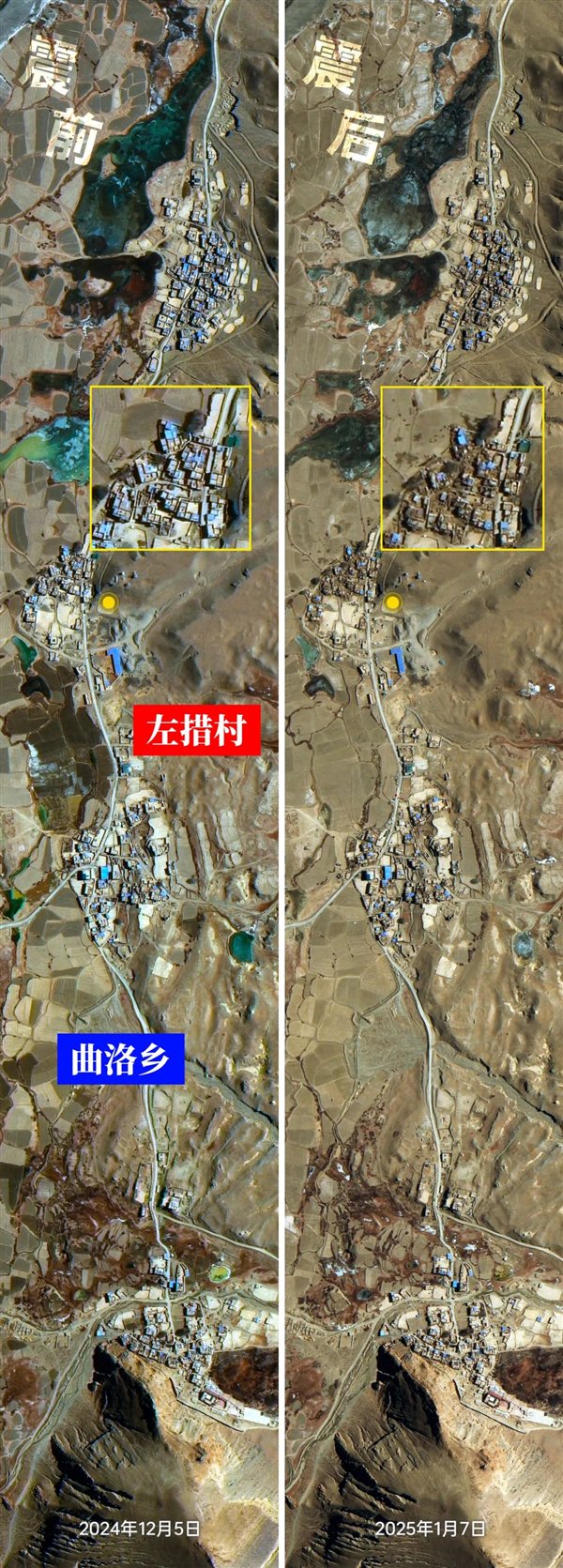 定日县措果乡是本次地震的震中所在地,受灾情况非常严重。根据吉林一号卫星拍摄到的高分辨率图像可知:措果乡的房屋多为土坯房,地震中倒塌严重。