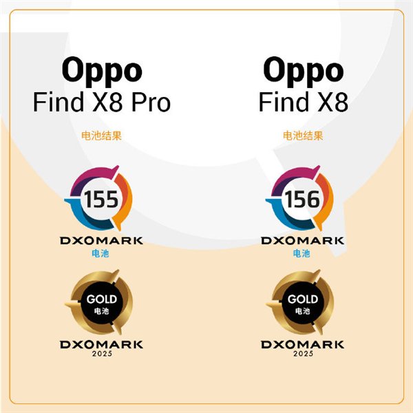 快科技1月9日消息,DXOMARK公布了OPPO Find X8系列的电池性能得分,X8和X8 Pro分别获得了156分和155分,Find X8以1分的优势超越了Pro版本。