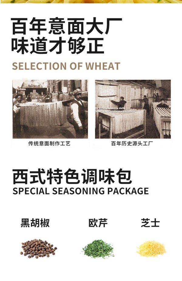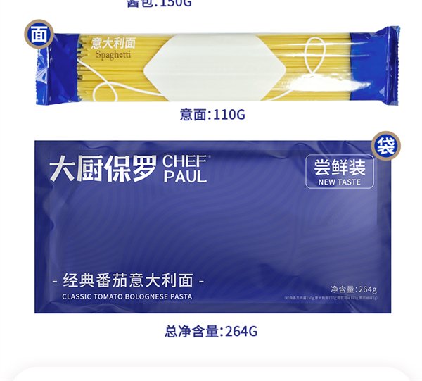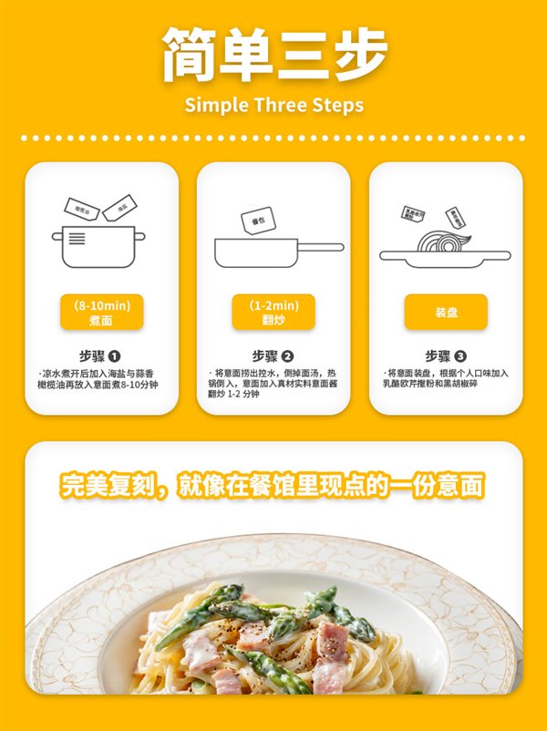 意面 + 酱包 + 黑胡椒 + 乳酪欧芹 + 海盐 + 蒜香橄榄油 = 一盒配齐。