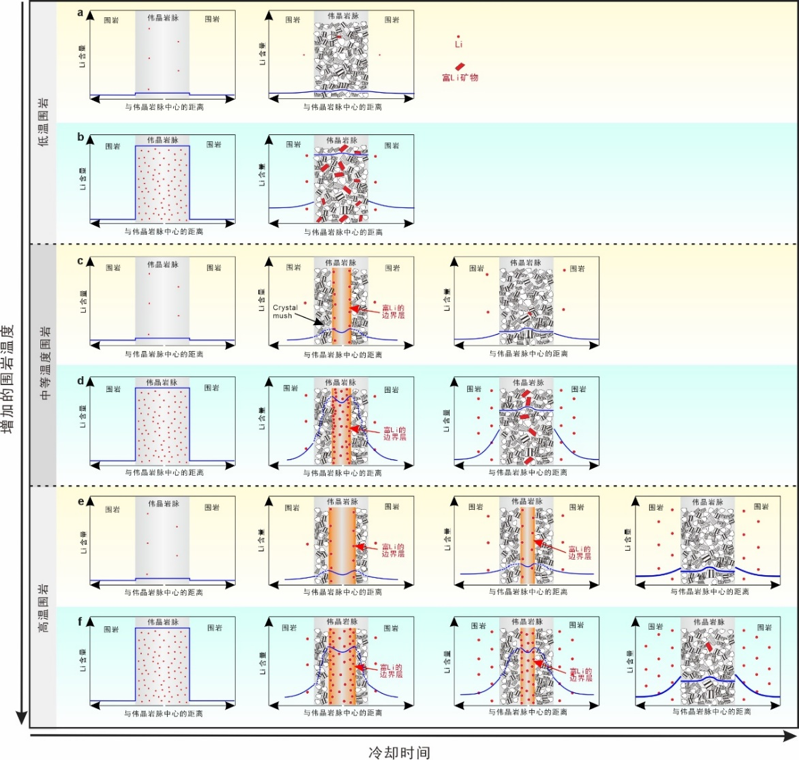 在靠近母岩体(岩浆储库)的高温围岩中,伟晶岩脉熔体中的锂会通过颗粒边界扩散作用迁移进入围岩,从而难以形成富锂伟晶岩;而在远离母岩体(岩浆储库)的低温围岩中,由于扩散作用有限,伟晶岩能够锁住大部分的锂并形成富锂矿物,从而有利于形成富锂伟晶岩,即绝大部分的富锂伟晶岩都分布在远离母岩体的低温围岩区域。