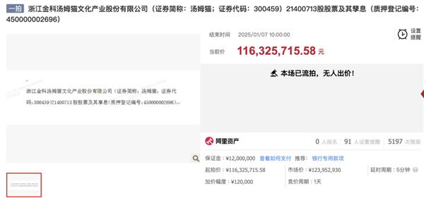 1 月 7 日,据阿里资产拍卖显示,浙江金科汤姆猫文化产业股份有限公司,股票遭遇流拍。