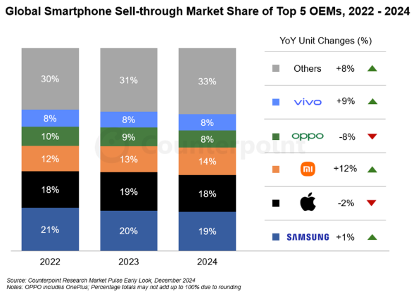 销售数据显示,苹果iPhone的市场份额在2024年降至18%,而三星也出现了下滑。相比之下,小米和Vivo等中国品牌获得了更多的市场份额。苹果的销量同比下降了2%,而全球智能手机销量增长了4%。