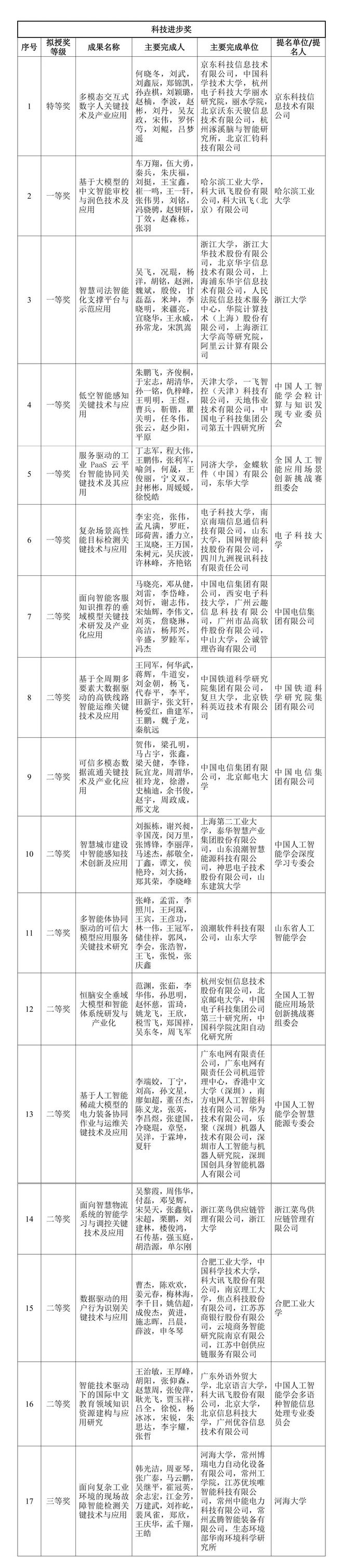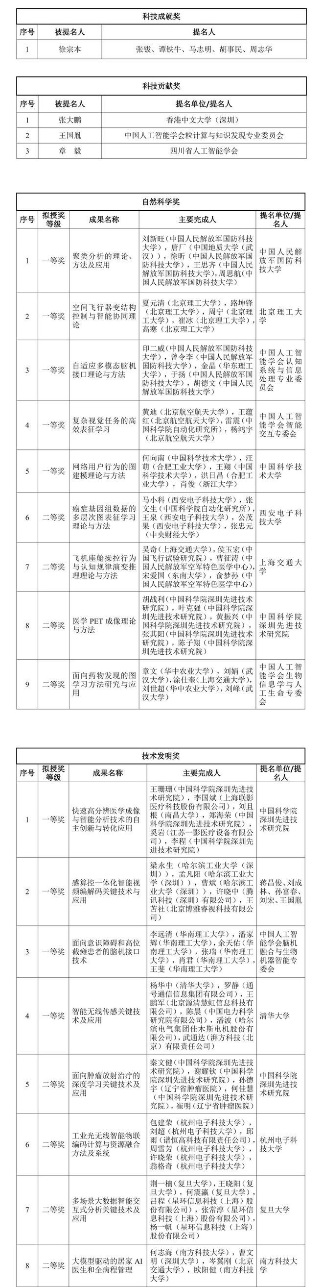 2024年度吴文俊人工智能科学技术奖拟授奖项目公示