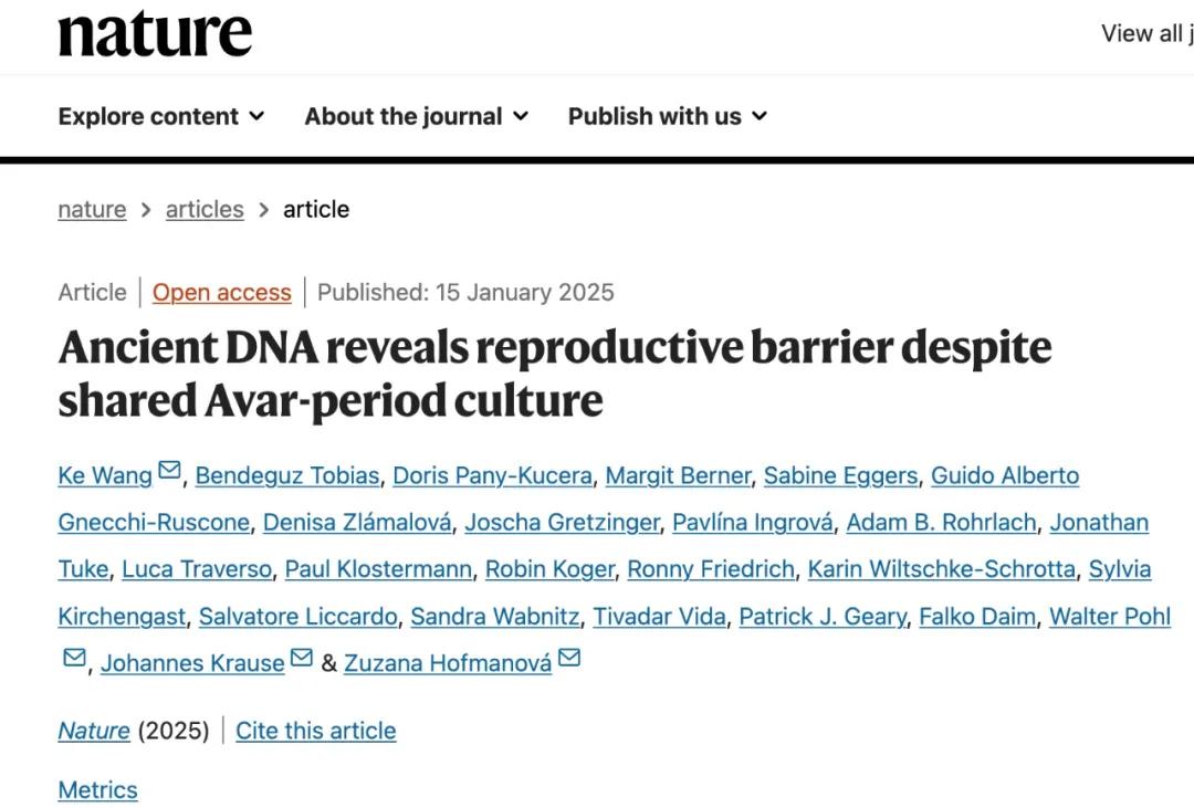《古DNA揭示阿瓦尔时代古人群在遗传屏障下共享(东亚)文化特征》(“Ancient DNA reveals reproductive barrier despite shared Avar-period culture”)的研究成果