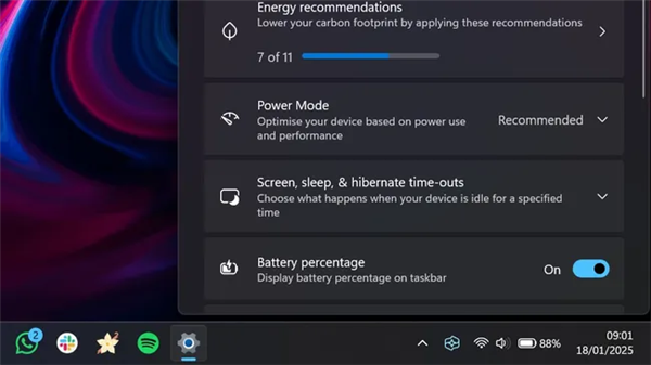 启用该功能后,电量百分比即可长期显示在系统托盘中,同时微软还提供了开关选项,用户可以在“设置”>“系统”>“电源”>“电量百分比”中根据自己的喜好选择是否显示电量百分比。