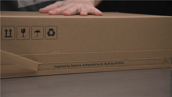 外包装采用了类似苹果iPhone包装封条的密封条,拆开密封条有一句“Inspired by Gamers. Enhanced by AI. Built by NVIDIA.(玩家启发,AI增强,NVIDIA打造)”的标语。