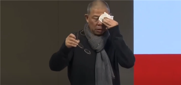 钟睒睒在演讲说到激动之处时,摘下眼镜,擦拭泪水。
