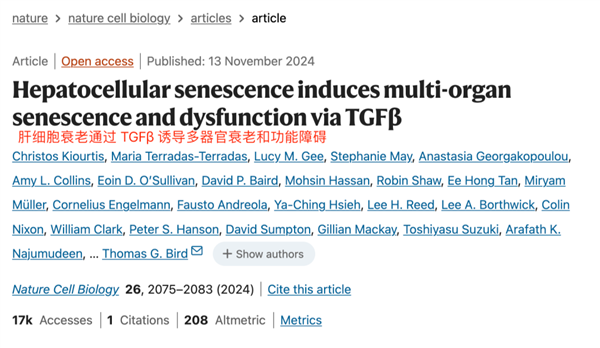 研究发现,肝脏衰老小鼠的血液中 TGFβ 的水平显著升高。阻断 TGFβ 信号通路后,肝脏衰老小鼠的肾脏和大脑中的 p21 表达明显减少,这表明这些器官的衰老得到了显著缓解。这一发现证实,TGFβ 在肝脏衰老的全身扩散中扮演了不可或缺的角色。