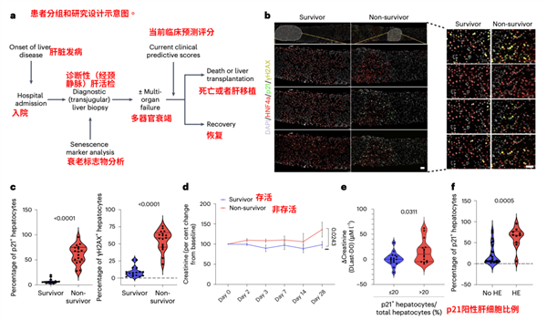 同时研究人员在急性肝炎患者队列中进行了验证:患者肝组织活检样本中 p21 和 DNA 损伤标志物 γH2AX 的表达水平显著升高。这些衰老标志物的表达不仅可以区分患者的生存和非生存结局,还与多器官功能障碍的发生呈显著相关。