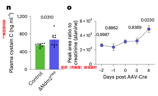 Mdm2Hep(肝脏衰老)小鼠的肾功能受损,表现为胱抑素C水平升高和尿液氨基酸排泄增加。