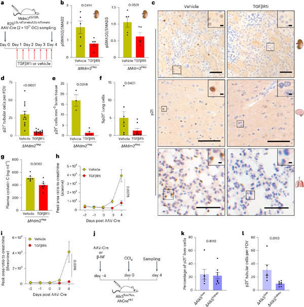 b-i:结果显示,TGFβR1抑制剂处理的小鼠肾脏、大脑和肺部的p21阳性细胞数量显著减少,肾功能得到显著改善。