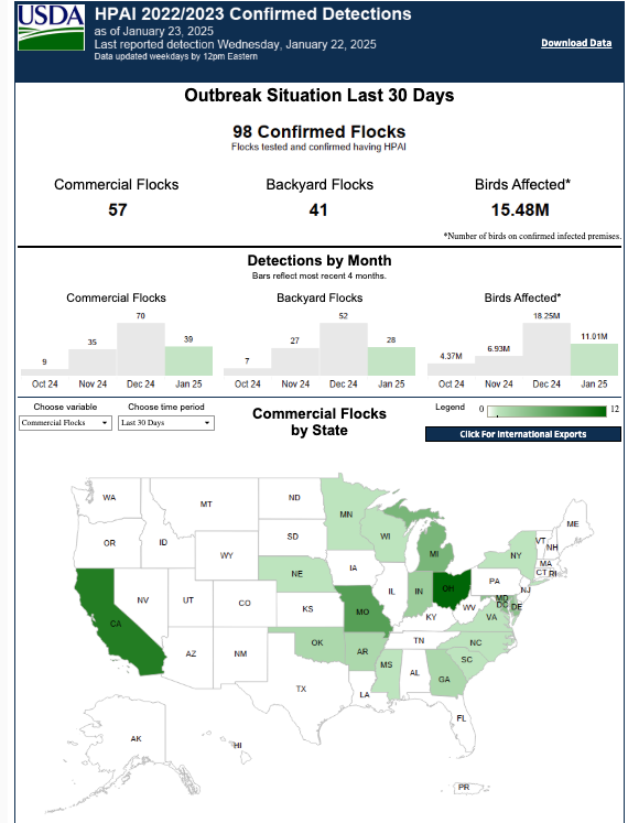 当然,造成鸡蛋价格暴涨的罪魁祸首,还是美国不断蔓延的禽流感疫情。根据美国农业部的禽流感仪表盘显示,过去30天内,美国本土48个州共有1550万只禽鸟感染禽流感。