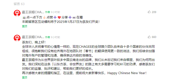 霸王茶姬表示:“很抱歉我们没有拉齐海外在地团队对‘春节’的翻译使用更一致的说法,我们后续会加强对海外账户的管理和沟通,确保表达内容的准确性。”