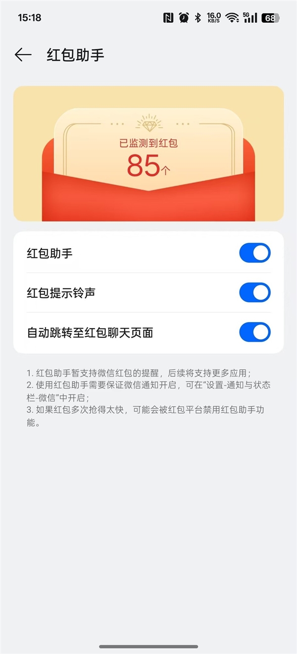 目前ColorOS 15的红包助手仅支持微信红包,还需要保证微信通知开启。
