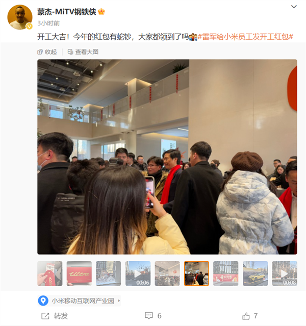 在小米科技园区内,小米CEO雷军身穿西装戴着红色围巾,手拿一打红包,给员工送上开工红包,现场员工排成长龙,雷军还满足了员工合影需求。