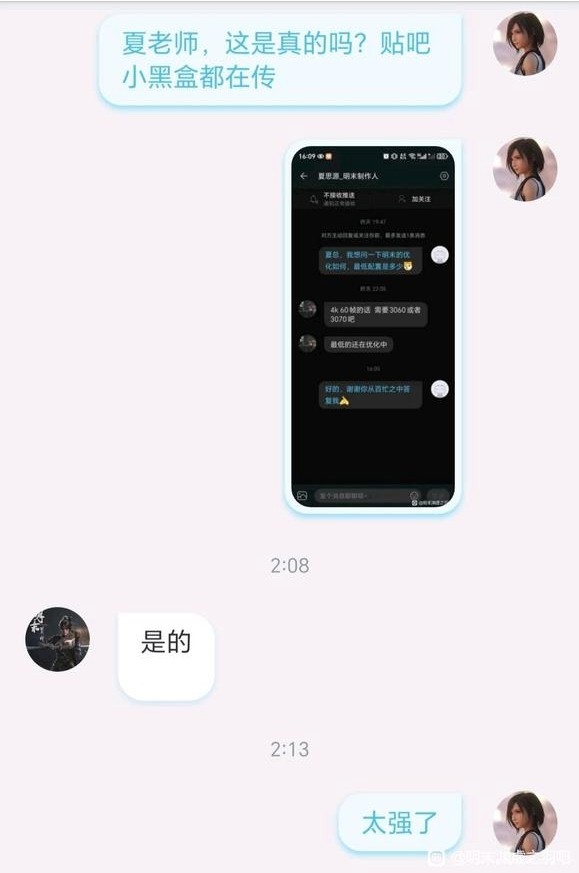 还有玩家不相信,再次询问夏思源这是真的吗?夏思源表示是真的,3060开了DLSS或FSR或TSR能上4K。