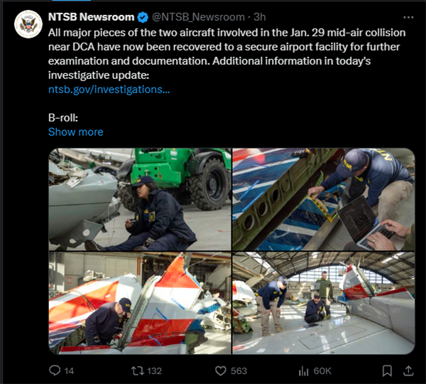 据央视新闻报道,美国国家运输安全委员会(NTSB)今日宣布,华盛顿两机相撞事故中失事客机和直升机的所有主要残骸都已找到。