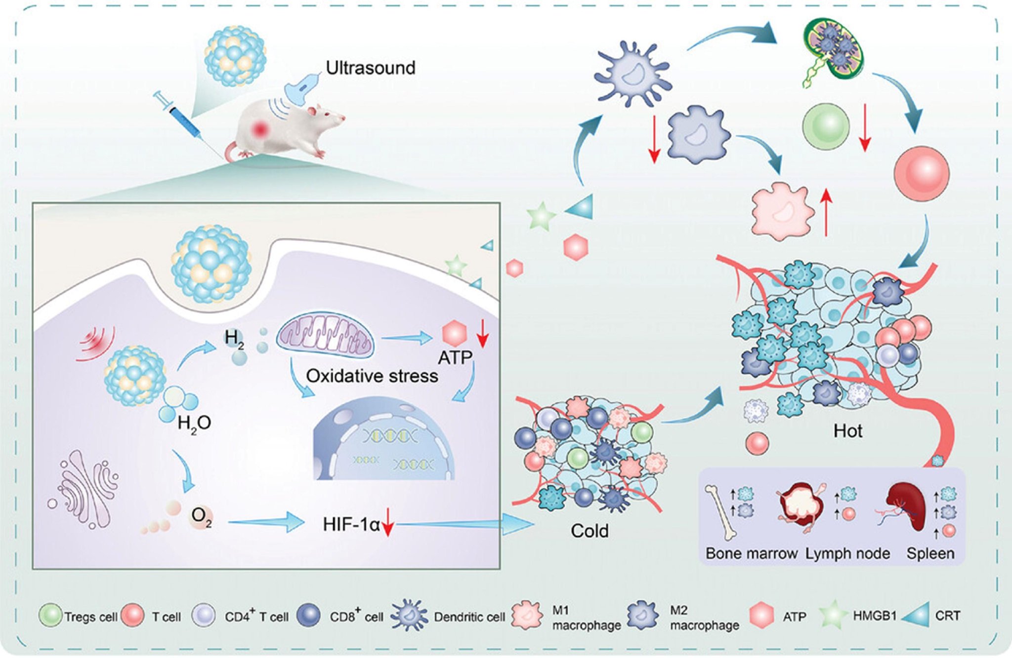 针对肿瘤的传统放疗、化疗副作用大且易复发,氢气疗法虽能抑制肿瘤代谢,却又难以深入病灶。该研究负责人、上海理工大学材料与化学学院副教授李钰皓介绍,此前关于铋基纳米材料的医学研究多聚焦单一治疗模式,此次研究将铋基材料与超声催化产氢氧气技术结合,提出“超声催化水分解”策略:利用超声波强穿透性,驱动纳米材料在肿瘤内分解水分子,原位产生氢气和氧气,从而实现“产气治疗+免疫激活”的双重突破。
