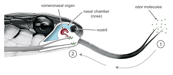 蛇的分叉舌头,也就是我们常说的“信子”,能够收集空气中的气味分子,并以嗅觉和味觉的双重模式,将这些信息传递到位于嘴部的特殊结构——犁鼻器中。