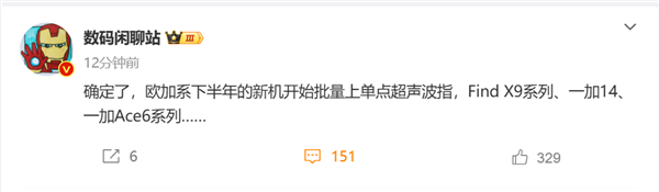 快科技2月12日消息,博主数码闲聊站爆料,欧加集团下半年的机型开始批量升级单点超声波屏幕指纹,包括OPPO Find X9系列、一加14系列以及一加Ace 6系列。