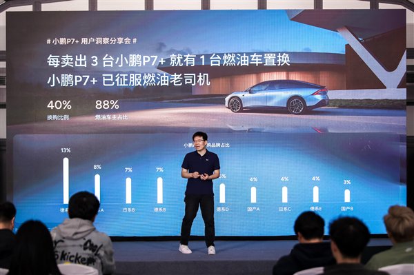 调研显示,每4个人试驾就有1个订单产生,其中25%的用户没有做任何对比就直接下定,真正的闭眼入,并且每卖出3台小鹏P7+就有1台燃油车置换。